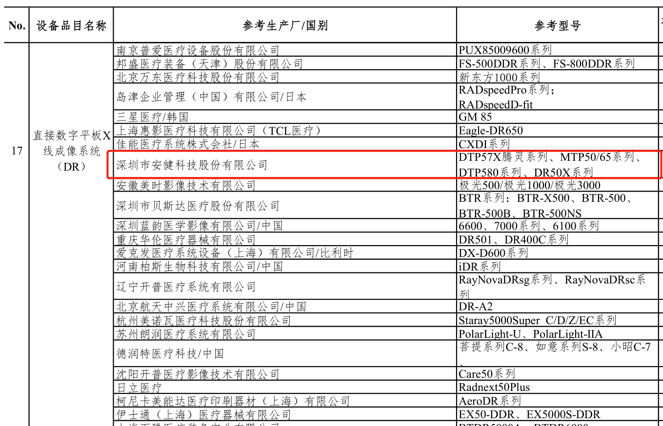 為全力配合國家衛生健康委疫情防治工作需要,2月20日,中國醫學裝備協會發布《新冠肺炎疫情防治急需醫學裝備目錄(第一批,第二批)》。該目錄由行業專家共同研究擬定,供各地疫情防治有關單位決策參考,以有效支援一線醫務人員,全力抗擊新冠肺炎感染疫情。安健科技包括DTP57X騰靈動態平板DR系列、DTP580動態平板DR系列、DP326飛燕移動平板DR系列、MTP50/65系列、DR50X系列在內的多款設備入選該目錄。