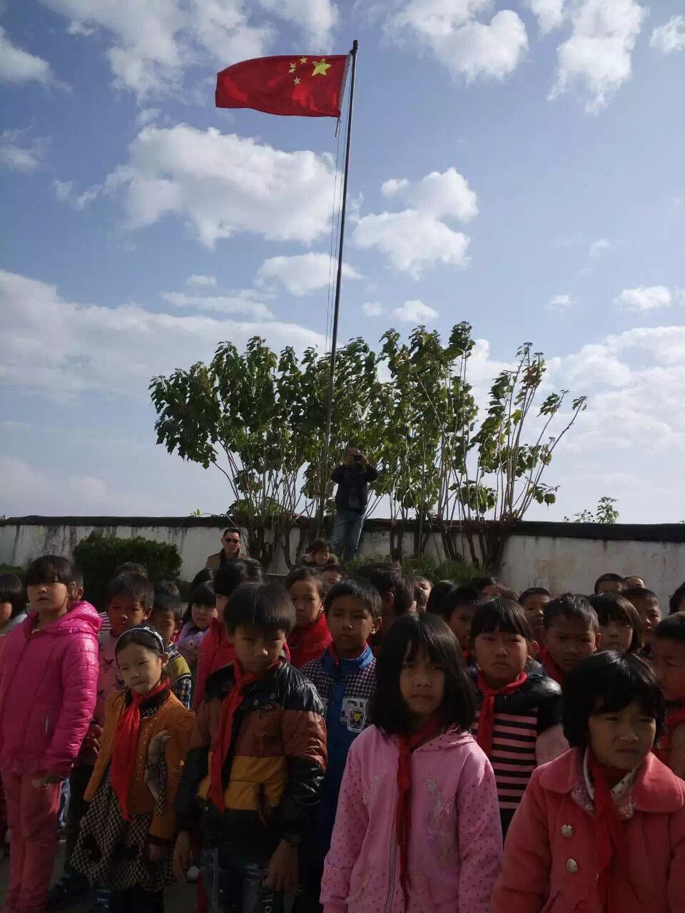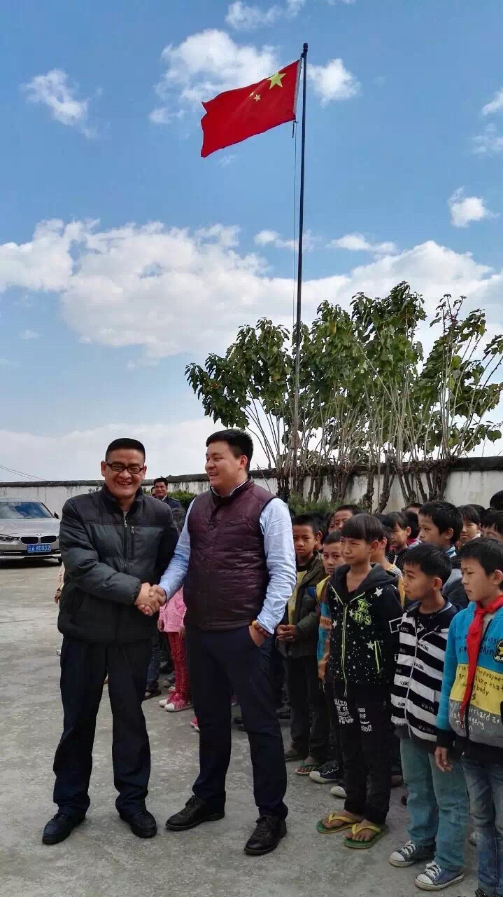 (藍天白云下,云南辦銷售總監王總與校長、孩子們在一起)